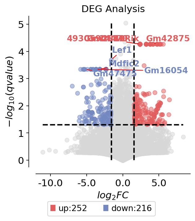 To visualize the DEG result, we use plot_volcano to do it. This fuction can visualize the gene interested or high different expression genes. There are some parameters you need to input: