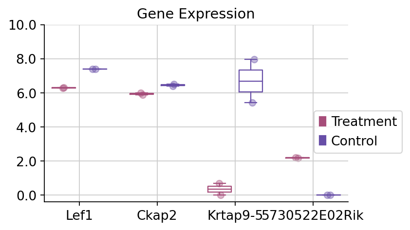 dds.plot_boxplot(genes=['Ckap2','Lef1','Krtap9-5','5730522E02Rik'],treatment_groups=treatment_groups,