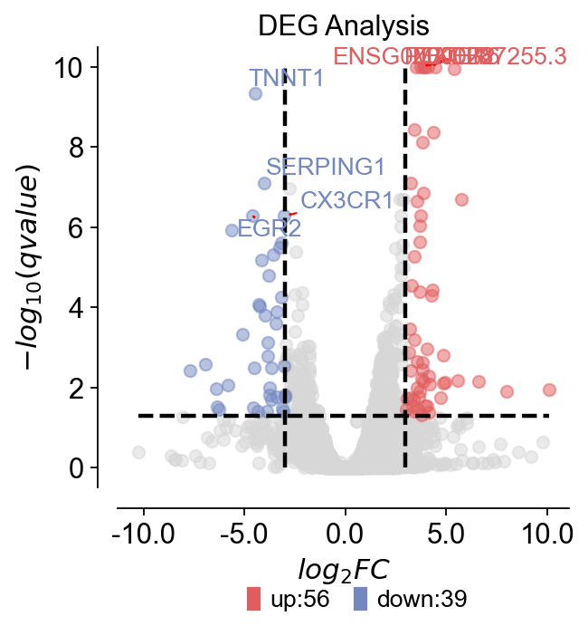 <Axes: title={'center': 'DEG Analysis'}, xlabel='$log_{2}FC$', ylabel='$-log_{10}(qvalue)$'>