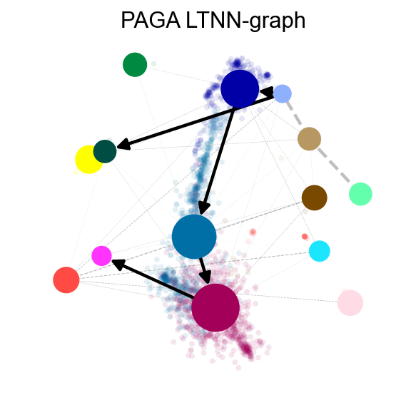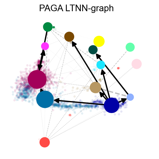ov.utils.plot_paga(adata,basis='mde', size=50, alpha=.1,title='PAGA LTNN-graph',