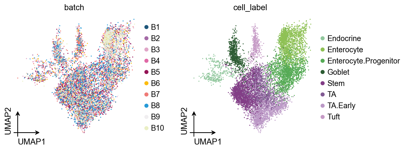 The data we use in the following example comes from [Haber et al., 2017]. It contains samples from the small intestinal epithelium of mice with different conditions. We first load the raw cell-level data. The dataset contains gene expressions of 9842 cells. They are annotated with their sample identifier (batch), the condition of the subjects and the type of each cell (cell_label).