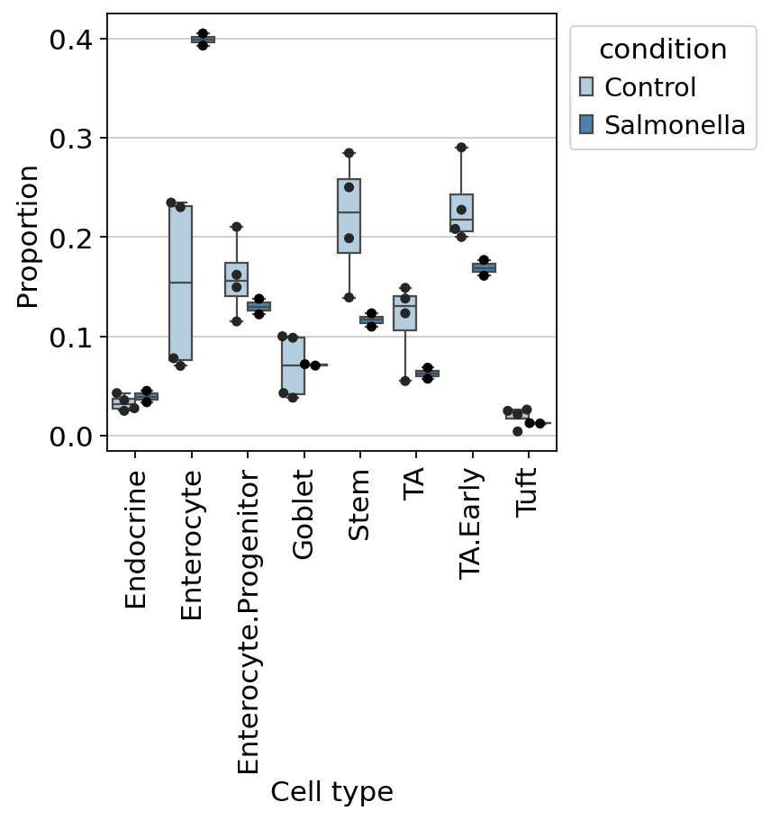For our first example, we want to look at how the Salmonella infection influences the cell composition. Therefore, we create a subset of our compositional data that only contains the healthy and Salmonella-infected samples as a new data modality.