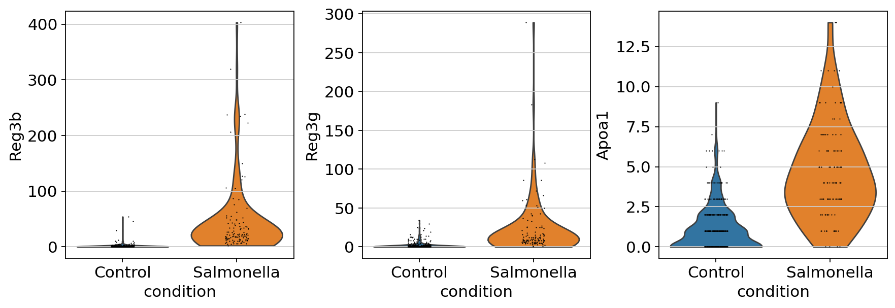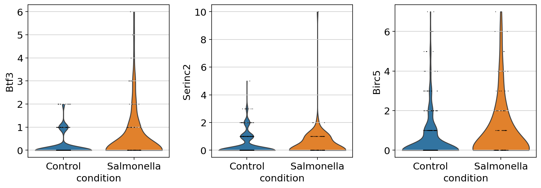We can use sc.pl.violin to compare the gene expression between different condition.