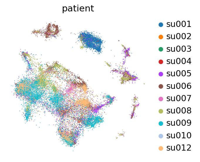 The sample data has multiple patients , and we can use batch correction on patients. Here, we using scVI to remove batch.