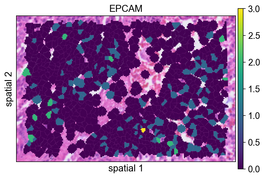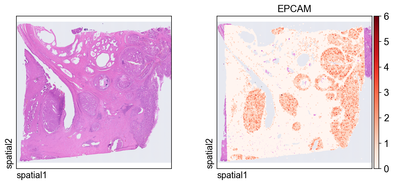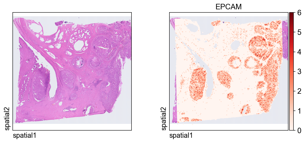 color=[None, "EPCAM"]: show both the histology image alone and the expression ofEPCAM.size: marker size for each spatial unit.linewidth=0: removes marker outlines for a cleaner dense plot.cmap='Reds': uses a sequential colormap appropriate for nonnegative expression values.