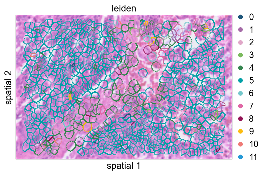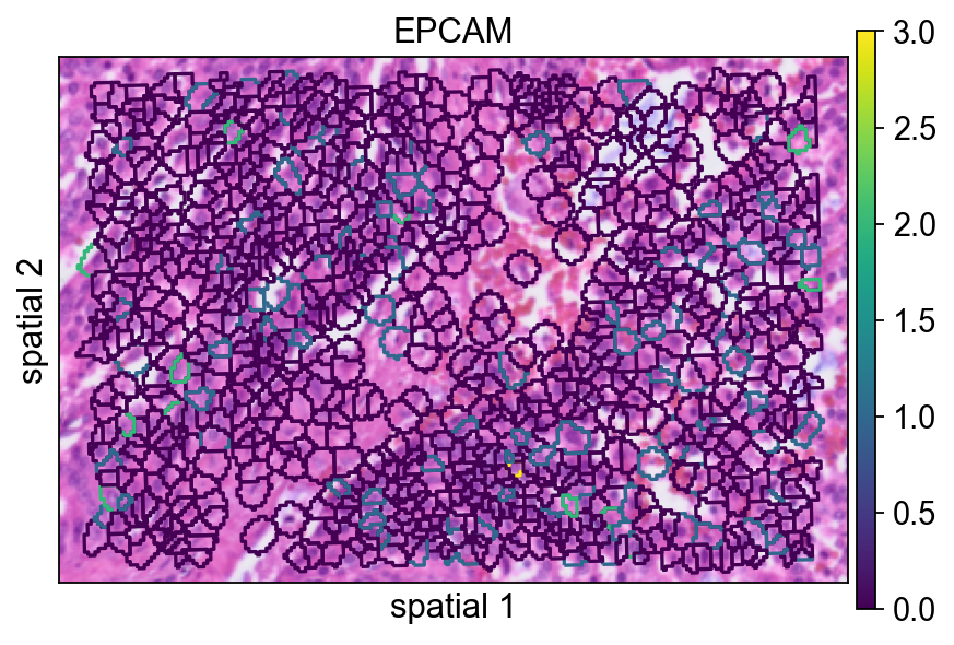 We now switch to the segmentation-level output, where observations correspond to segmented cells instead of regular bins. This representation is usually more appropriate for cell-level visualization, spatial feature discovery, and clustering.